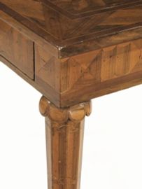 in noce e radica di noce, piano rettangolare intarsiato a motivi geometrici romboidali e fiori, un sottile cassetto nella fascia, gambe scannellate, cm 75x49x92, piccoli danni (2)