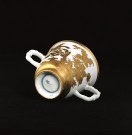 in porcellana dipinta in blu sottosmalto e sovradipinta in oro, decorate a motivi vegetali e volatili. Marca entro doppio cerchio in blu su ciascun pezzo, alt. cm 6,8, piattini diam. cm 11,8 (4)