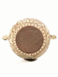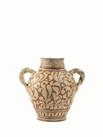 in terracotta ingobbiata, invetriata e graffita a stecca ribassata, tracce di ossido di cobalto al collo. Il decoro mostra un motivo a tralci fogliati e, sul fronte, un cavaliere. Sotto il piede reca, inciso a crudo, la scritta: "1 ottobre - M(astro).C (ono). Lazzaro Si obbliga a Don Giuseppe Almerico Sacerdote alla terra di Biscalquino (Bisacquino) di fargli 32 vasi fia ( o sia) bornìi da qua (d’acqua) onzi 35 e tarì 15 – 1611”, alt. cm 22,5