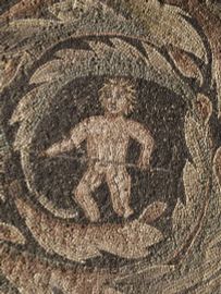 Pannello in mosaico policromo, decorato con due grandi volute di foglie di acanto che inquadrano un putto armato di lancia in atto di assalire un leone accucciato e retrospiciente; in basso a sinistra è rappresentata una pernice volta a sinistra