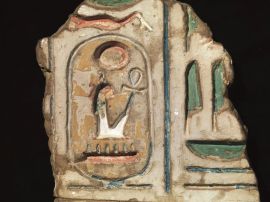 Rilievo raffigurante il faraone Sethi I nelle vesti di Osiride. Il frammento conserva la testa del dio Osiride volto a sinistra con la corona atef affiancata dalle due grandi piume di struzzo che simboleggiano la Verità e la Giustizia, il volto è dipinto in verde-azzurro, colore caratteristico della divinità che regna sull’Oltretomba; nella parte superiore si conservano tracce di due colonne di scrittura geroglifica sinistrorsa, in quella di sinistra è interamente conservato il nome del trono Menmaatra (Stabile è la Giustizia di Ra) iscritto all’interno del cartiglio; nella colonna accanto sono riconoscibili due foglie di palma affiancate e l’epiteto nb tawy (Signore delle due Terre).