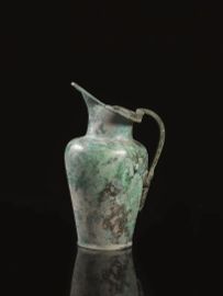 Materia e tecnica: lamina di bronzo martellata per il corpo; bronzo fuso e cesellato per l’ansa