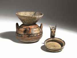 Materia e tecnica: argilla beige chiaro; ingubbiatura camoscio, vernice bruna e paonazza, modellati a tornio lento