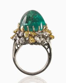 al centro uno smeraldo cabochon pan di zucchero entro cornice di diamanti rotondi e marquise incolori e gialli fancy, punzoni Pt 900 e 750, g 14