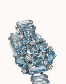 realizzato ad una fila di acquemarine rettangolari, al centro un motivo triangolare sagomato in acquemarine ovali e rotonde e brillanti baguette, quadrati e rotondi, punzoni Cartier Fall e 1930, g 43