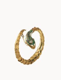 di forma a serpente con corpo in oro liscio e satinato cesellato e modellato a scaglie, la testa decorata da smalti bianchi e verdi e impreziosita da smeraldi, rubini e un brillante, g 61