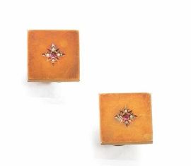 DUE PAIA DI BOTTONI IN ORO GIALLO, ORO A BASSO TITOLO, MICROMOSAICI, PERLE E RUBINI