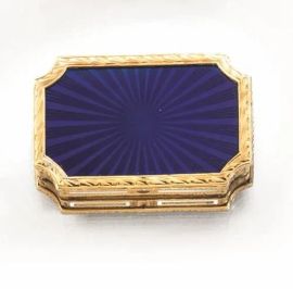 rispettivamente di forma rettangolare sagomata decorata in smalto giallo con cornice cesellata e motivo floreale al centro, di forma rettangolare scantonata decorata in smalto blu, con profilo ovale in smalto verde e motivo floreale a volute al centro, g 97 lordi