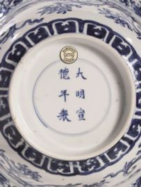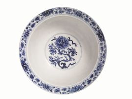 in porcellana bianca e blu, l'esterno decorato con rami di crisantemi, peonie e ibisco, l'orlo decorato con fiori di loto e foglie, l'interno decorato con un crisantemo in fiore e foglie, recante marchio Xuande apocrifo