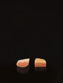 uno in tian huangshi dalla forma ovoidale e sormontato da animale fantastico e recante iscrizione, alt. cm 3, l'altro in giada bianca, alt. cm 2,5 (2)