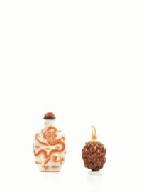 una in porcellana, decorata con un motivo di drago, alt. cm 7.5, l'altra in cocco modellata nella forma di frutto, alt. cm 6