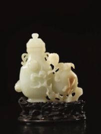 in giada bianca con lievi inclusioni color ruggine, modellato nella forma di un contenitore con al fianco un piccolo vaso ad anfora entrambi avvolti da racemi foriti, alt. cm 12,5, poggiante su base in legno lavorata