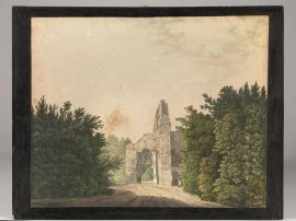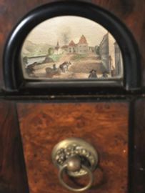 in radica di noce con parti ebanizzate, parte superiore modellata a tempietto con due finestrelle per visionare le immagini, parte inferiore con due finti sportelli con formelle cuspidate inquadrate tra colonne, base rettilinea, cm 99x63x156, completo di otto tavole