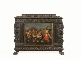 parte superiore ad urna da alzarsi decorata con girali vegetali, fronte con inserti in tela dove sono raffigurate SCENE DI GENERE, SCUOLA DELL'ITALIA DEL NORD, SECOLI XVII-XVIII, base baccellata, piedi a zampa ferina, cm 125x51,5x104 (2)