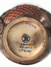 maiolica a lustro metallico con decoro a palmette, fiori e sole nei toni del blu, rosso e verde. Reca sul fondo il marchio graticola, CHINI&Co. MUGELLO ITALIA, 423/2618, alt. cm 25