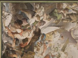 Insieme al disegno a penna e inchiostro bruno conservato al Gabinetto Disegni e Stampe degli Uffizi (Inv. 92299. Newcome/Grasso, D24), questo grande acquerello dal complesso registro compositivo, testimonia la partecipazione di Giovanni David al concorso indetto nel 1782 per la decorazione di volta della Sala del Maggior Consiglio nel Palazzo Ducale di Genova. Il rifacimento delle decorazioni del palazzo, distrutte da un incendio nel 1777, fu deliberato dalle autorità cittadine che nell’aprile del 1778 invitarono finanziatori privati a sostenere il progetto. La famiglia Giustiniani, raccogliendo l’invito del consiglio, bandì un concorso il 13 agosto 1782; i progetti dovevano misurare 50 palmi in lungo e 19 palmi in larghezza. Parteciparono al concorso 15 artisti i cui bozzetti furono esposti nell’agosto 1783 nel Chiostro di Santa Maria di Castello per 12 giorni. La candidatura di David, caldeggiata da Charles de Wailly, non valse all’artista la selezione fra i tre finalisti che la giuria, composta da alcuni membri di casa Giustiniani, dal doge Airoli e i pittori Antonio Villi e Giambattista Gnecco, scelse in Giovanni Cristoforo Unterberger, James Durno e Giandomenico Tiepolo.