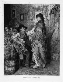 Giubbini, 20. Firmata sulla lastra in basso a destra e a caratteri tipografici. Da un dipinto di Giacomo Favretto. Stampata da Carlo Lovera a Torino nel 1879 per la cartella della XXXVIII Esposizione della Società Promotrice di Torino.