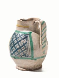 in maiolica decorata in policromia con verde, arancio, giallo e blu, corpo ovoidale poggiante su piede largo e piano appena svasato e con orlo arrotondato. La bocca è trilobata e il manico, a nastro robusto, si diparte appena sotto l’orlo per scendere fino alla pancia del contenitore. La foggiatura è al tornio; lo smalto bianco ricopre l’intera superficie nella zona anteriore del ventre e una fascia all’interno. Sul fronte, entro una corniciatura circolare con motivo decorativo “a scaletta”, è schizzato un paesaggio che vede protagonista una casa dal tetto spiovente, realizzata con colori caldi, in un prato erboso in verde ramina cupo. La restante superficie, ad esclusione del manico, è decorata da una larga fascia ornata da tratti obliqui e paralleli in blu cobalto che vanno a formare una densa quadrettatura a maglia larga e fina. Due linee parallele ornano il collo, alt. cm 19,7, diam. cm 9,5