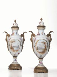 porcellana dipinta in policromia e oro con applicazioni in bronzo dorato. Corpo ovoidale decorato sul fronte da scene galanti incorniciate da festoni e girali dorati intervallati da fiori policromi; sul retro paesaggi entro cornici vegetali. Ampie prese laterali in bronzo dorato sagomate a motivo vegetale, basi quadrangolari, rivestimento del collo e prese dei coperchi a pigna anch'esse in bronzo dorato. Marca Sèvres centrata da lettera E,