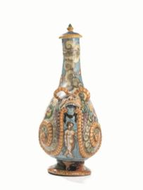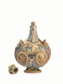 in maiolica dipinta in policromia con verde, giallo, giallo arancio, blu di cobalto, bruno di manganese nei toni del nero-marrone. La fiasca, piriforme, presenta anse a rilievo in forma di mascherone, che interessano i fianchi e si estendono nella porzione inferiore della vasca con volute. La fiasca è corredata da un tappo a vite. Nel decoro istoriato si riconosce il mito di “Antiope sedotta da Giove in veste di satiro. L’opera trova riscontro nella produzione della bottega urbinate di Orazio Fontana, e l’attribuzione si basa sul confronto pittorico delle figure e sul confronto morfologico: la bottega produsse infatti questo tipo di opere per tutto il ‘500. Opere simili sono conservate presso il Museo Di Praga, il Victoria and Albert Museum di Londra, il Museo Nazionale di Stoccolma e l’Anton Ulrich Museum di Braunsweig. Un esemplare simile, ma con diversa scelta morfologica nella forma delle anse, è conservata al museo Civico Medievale di Bologna. Si segnalano poi la fiasca del J. Paul Ghetty Museum in California (cfr. C. Hess, Italian Ceramics: Catalogue of the J. Paul Ghetty Museum Collection, 2002, no. 34 e bibliografia relativa). Sul fondo etichetta della collezione collezione parigina del Barone Gustave de Rothschildt (1829-1911), passata in eredità al Barone Henri de Lambert, Bruxelles; quindi alla Baronessa de Lambert, Bruxelles e New York; poi esitata a New York il 7 marzo 1941 (Sotheby’s, Parke Bernet, “Lambert Sale”), alt. cm 44.