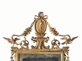 in legno intagliato e dorato sormontato da alta cimasa con medaglione scolpito con la figura di Antinoo in nudità eroica, e con nastri e ghirlande di fiori ricadenti e sostenuti da aquila con le ali spiegi negli angoli, cornice rettangolare con bordo a guilloche, zampe modellate a cornucopia, cm 245x130, piccoli restauri