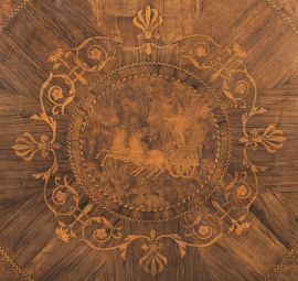Grande tavolo da centro, Rolo, ebanista Alfonso Mari, metà sec. XIX, in noce e radica intarsiati, piano circolare centrato da grande medaglione con Apollo in nudità eroica alla guida del carro del sole inquadrato tra volute di foglie di acanto e palmette, fusto a balaustro sfaccettato su base tripode decorata da grandi palmette aperte a ventaglio, diam. cm 116, alt. cm 77, corredato di poesia autografa dell'ebanista Alfonso Mari l'anno 1864