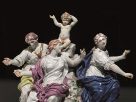 Sia le figure delle Parche che il putto, si ritrovano, in bianco, come elementi dell’imponente Tempietto donato da Carlo Ginori all’Accademia Etrusca di Cortona e realizzato dalla Manifattura tra il 1750 e il 1756 (Rita Balleri, Il Tempietto Ginori dell’Accademia Etrusca di Cortona: una rilettura, in Laura Casprini Gentile e Dora Liscia Bemporad, Artisti per Doccia, Firenze 2009, pp. 7-21). Il gruppo qui presentato, come suggerisce l’impostazione frontale, era destinato ad essere esposto come scultura da tavolo in gallerie o altri ambienti di rappresentanza. Questa categoria di gruppi plastici è descritta nella “Tariffa dei prezzi delle porcellane della fabbrica di Doccia” del 1760 circa (Leonardo Ginori Lisci, La porcellana di Doccia, Firenze 1963, p. 235) sotto la voce “Robe diverse da Camera o da Galleria” dove si precisa, come è stato già notato da Luca Melegati che, qualora dipinti, questi pezzi “si vendono il doppio”. Il costo elevato spiega la rarità di gruppi policromi di queste dimensioni nella produzione di Doccia a noi nota. La cromìa e il gusto rococò della base fanno propendere per una datazione approssimativa tra il 1755 e il 1770.