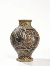 in maiolica policroma a fondo blu, di forma ovoidale con collo allungato ed orlo piatto, la parte centrale decorata a trofei, cartigli con iscrizione SPQP e riccioli graffiti, al centro medaglione ovale con cornice a volute entro cui è raffigurato San Lorenzo Martire con paesaggio sullo sfondo; le fasce inferiori rispettivamente decorate a foglie d’acanto entro riserve a mandorla e motivo a nastri intrecciati, Il collo decorato da due fasce a tralci di foglie, alt. cm 34, vaso frammentato e ricomposto, sbeccatura all’orlo