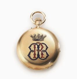 Cassa guilloche con stemma a rilievo sul fronte e monogramma inciso sul retro, corona di carica a ore 3, fondello inciso Chronometre Rossels & Fils Geneve, Suc.sr de J.F. Bautte, Geneve, n. 91834. Quadrante in smalto bianco con numeri romani e minuti in numeri arabi, secondi a ore 6, lancette piriforme e a foglia. Movimento a carica manuale. Diam. mm 54