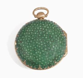 Cassa in ottone dorato liscio, due controcasse di cui quella interna in ottone dorato incisa a motivi floreali e attrezzi da giardinaggio, quella esterna rivestita in zigrino verde e decorata da borchie dorate. Quadrante in smalto bianco con ore in caratteri arabi orientali. Movimento con scappamento a verga con carica e rimessa a chiave. Movimento e quadranti firmati. Diam. mm 52