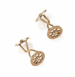 un paio, Gucci, modellato a doppio timone, punzone 750; un paio di gemelli in oro e metallo brunito disegnato a staffa, punzone 750; paio di gemelli in bambù e metallo di forma allungata sagomata, g 27 complessivi