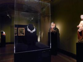 La parte anteriore composta da due spille a clip amovibili ciascuna modellata come un'ala con estremità snodabile interamente decorata in pavé di diamanti rotondi taglio brillante e singolo; la venatura centrale formata da una linea curva in baguette poste in gradazione. Ciascuna ala si diparte da una composizione floreale stilizzata composta da quattro elementi a volute in brillanti centrate da diamanti. La parte posteriore realizzata a due file di diamanti taglio brillante e baguette posti in lieve gradazione. Fermatura in oro bianco. Clips databili 1953 con punzoni Cartier Paris 011 815, lungh. cm 10, largh. cm 3. Collana databile 1938, punzoni Cartier Paris DEPOSE' 01067