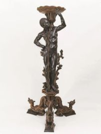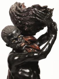in legno scolpito ed ebanizzato con inserti in avorio dipinto, modellato a figura negroide con folti capelli ricciuti, nudo ad eccezione di una pelle di leone drappeggiata sulle spalle e annodata in vita, in atto di sostenere una conchiglia, su base modanata esagonale sostenuta da tre tartarughe, altezza complessiva cm 202, piccoli danni
