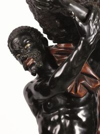 Il “fornimento Venier”, quaranta opere scultoree che Brustolon realizzò per il palazzo della famiglia veneziana a San Vio, è costituito da portavasi, seggioloni e altri arredi scolpiti in legni pregiati con soggetti mitologici e allegorie; fra questi l’Etiope portavaso, raffigurato nudo in posa eroica anche se con una catena al collo, sorgente da una base con mostri marini, è il diretto modello del grande moro che viene qui presentato.