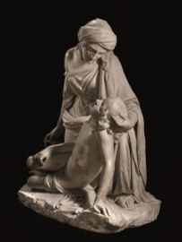 Come doveva essere avvenuto nel Concorso accademico del 1840, anche qui Caselli sembrava volersi confrontare con Dupré, in questo caso non nello stesso soggetto, ma nel motivo della figura del fanciullo nudo: lui Ismaele, l’altro Abele. Nel cimento con quel capolavoro destinato ad una grande fortuna Caselli risulta comunque non sfigurare, per la sensibilità anatomica e la sensualità con cui ha saputo rendere il corpo di Ismaele che, sfinito dalla sete, appare sollevato su un fianco, mentre la madre Agar tiene sollevato il volto cui guarda, in una corrispondenza di amorosi sensi, con infinito affetto. Il giovane scultore ha dunque saputo rendere con grande intensità l’episodio biblico che, in quanto espressione di un dolore universale, aveva e continuava a godere di una grande popolarità. Era il dramma della madre che, finita l’acqua e vedendo il figlio morire, aveva perso con ogni speranza anche la fiducia in Dio. In un momento in cui la scultura prediligeva ancora il mito e comunque motivi ispirati all’antichità classica, Caselli, come Dupré, si rivolgeva invece alla Bibbia vista come fonte di temi più rispondenti alla sensibilità contemporanea. Dimostrando le sue capacità e la sua ambizione, lo scultore senese si misurava con un tema che aveva conosciuto una grande fortuna in pittura, con esempi celebri, come Guercino, Van Dyck e Batoni, per quanto riguarda gli antichi maestri, e come Horace Vernet, Ary Scheffer, Piccio e Overbeck, se pensiamo ai più celebri pittori contemporanei. Questo gruppo addirittura precede, se pensiamo che la sua prima redazione è del 1842, il dipinto Agar e Ismaele di Adeodato Malatesta, realizzato tra il 1845 e il 1859, per poi diventare, dopo un così lungo percorso creativo che aveva creato molta attesa, una delle opere più celebri di quegli anni. La singolarità della versione in scultura di Caselli sta proprio nell’aver saputo risolvere il rapporto tra le due figure e rendere i dettagli con una sensibilità pittorica, in anni in cui, come nel caso del rapporto tra Vincenzo Vela e Francesco Hayez, vediamo interessanti interferenze tra le due arti. Del resto la stessa figura di Agar dimostra una sensibilità che richiama quella delle popolari eroine bibliche, come Ruth o Tamar, dello stesso Hayez.