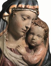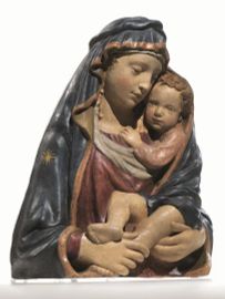 Questi rilievi, sovente foggiati a calco sia in argilla che in stucco - come appunto l’esemplare in esame - secondo un procedimento assai diffuso nelle botteghe dei principali scultori fiorentini adatto a soddisfare le diverse esigenze di un vastissimo mercato che si estendeva ben oltre i confini della Toscana, interessato ad acquistare versioni più accessibili di modelli particolarmente apprezzati e venerati, erano nobilitati e differenziati da variegate policromie affidate a pittori specializzati, come Bicci di Lorenzo ed il figlio Neri: vere e proprie “pitture a rilievo” (Gentilini 2012), espressione del serrato “dialogo” tra le arti affermatosi in quegli anni a Firenze e testimonianza emblematica del primato artistico e commerciale di questa città (Mozzati 2013). Così anche nell’esemplare in esame è proprio la sensibile policromia, rimessa in luce da un recente, accurato restauro condotto da Chiara Piani (studio I Bastioni, Firenze, 2013-2014), che contribuisce non poco a qualificare l’immagine e persino a definire il risalto plastico, conferendo morbidezza e nobiltà agli incarnati di una delicata tonalità perlacea, vivacità ai guizzanti riccioli lumeggiati del Fanciullo, e una preziosa sostanza serica ai tessuti, dove si apprezzano in particolare la nuance rosso cremisi della veste di Maria e quella verde oliva del rovescio del manto, blu ardesia bordato d’oro.