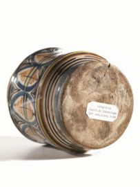 Fausto Berti nel pubblicare questa tipologia decorativa sottolinea come a partire dalla metà circa del XVI secolo la produzione di maiolica cominci a riproporre i motivi ornamentali con stanchezza e in modo ripetitivo. Questa tendenza è maggiormente evidente proprio nelle maioliche da farmacia destinate a un uso meno prestigioso. L’ornato “ad ovali” del nostro vaso appartiene a questa fase, in cui gli artigiani tendevano a semplificare e a ripetere in modo frettoloso, quasi esasperato, la decorazione commissionata.