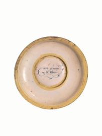 La sigla di bottega posta alla fine dell’iscrizione, pur se con alcune variazioni, ci pare simile a quella presente nel piatto con Astolfo, oggi in una collezione tedesca, attribuito a Nicola da Urbino, che presenta anche una grafia simile a quella del nostro esemplare.