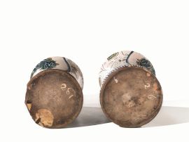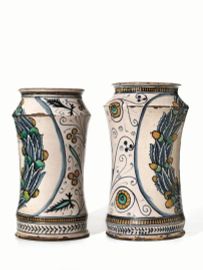 I due contenitori apotecari hanno corpo cilindrico rastremato al centro, imboccatura larga con orlo svasato, un collo breve e spalla molto carenata. Il piede piano non smaltato, diviso dal corpo da una breve strozzatura, ha orlo arrotondato. Il corpo ceramico color camoscio scuro è ben visibile all’interno dei vasi, che non sono rivestiti da smalto, ma solo da invetriatura.