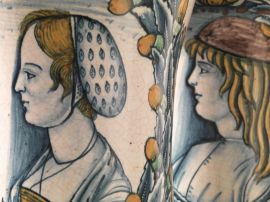 L’albarello b), fortemente coerente, è decorato da un profilo muliebre con capelli raccolti in una cuffia, abito con bustino e spalle coperte da uno scialle. Il profilo è circondato da una ghirlanda con foglie di quercia e piccole ghiande; anche in questo caso la ghirlanda è centrata da due fiori racchiusi in un medaglione. Il retro del vaso è occupato da un tralcio fitoforme con arricciature, piccole fogliette trilobate e fiori dalla corolla multipetalo, dipinti in verde e arancio. Il fondo vuoto è riempito da pennellature, cerchietti puntinati e spiraline. Lungo la base, un motivo a cordone, seguito da una corona stilizzata, riprende la decorazione del collo.