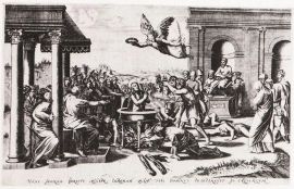 Anche quest’opera, come già detto per il lotto 38, va accostata a quelle prodotte prima dell’arrivo dell’Avelli a Urbino e si aggiunge alla serie cosiddetta Y/φ, quindi al periodo anteriore al 1530. Dal confronto stilistico con altre sue opere possiamo comunque assegnare il piatto a un periodo già maturo, in cui egli aveva ormai affinato la sua tecnica e produceva scene dallo stile ormai fortemente caratterizzato. La vicinanza con il piatto firmato presentato al lotto 39 di questa vendita è evidente: l’uso dei colori ricchi – l’arancio, il violaceo e il verde molto carico – è ormai quello caratteristico del pittore rovigino. Ci conforta il paragone tra alcuni dettagli dell’oggetto in esame e particolari simili presenti in altre opere: si confrontino, per esempio, il paesaggio del nostro piatto con quello presente sul piatto con l’Allegoria del Tempo del City Council Museum di Glasgow, o anche il modo di rappresentare l’ombra del fornice del molo nella nostra opera e in una coppa con San Geronimo e il Beato Colombini in preghiera, anch’essa al museo di Glasgow, databile al 1528-1530.
