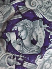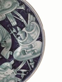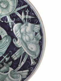 L’ornato di questo piatto appartiene alla decorazione “all’antica” detta “a trofei”: fortunato motivo delle maioliche rinascimentali a Venezia e in tutt’Italia, molto diffuso attraverso le incisioni. Il decoro del nostro piatto vede forte affinità con stampe coeve (celebri quelle di Enea Vico).