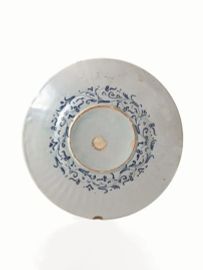 Il retro presenta una decorazione “alla porcellana” a punta di pennello tracciata in blu attorno al basso anello di appoggio, su fondo di smalto appena azzurrato.