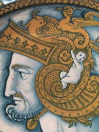 Anche tecnicamente il piatto mostra chiare analogie con quello a figura femminile appena citato. Il decoro è stato realizzato lasciando a risparmio il fondo maiolicato, fortemente distinto dalla parte a lustro grazie a linee di cobalto stese con maggiore o minore densità, così da creare un gradevole effetto di ombreggiatura che dà profondità all’opera. Un importante esemplare di confronto è il piatto da pompa con busto di guerriero del Museo delle Arti Decorative di Lione: anche in quel caso il decoro e la tecnica sono raffinatissimi. Il giovane protagonista della decorazione è raffigurato di fronte e indossa un elmo alato con una lorica, arricchita da una lavorazione fitta ed elegante, quasi un lavoro di oreficeria. Anche la tesa di quell’esemplare è molto simile alla nostra, per la cui datazione si fa ugualmente riferimento al piatto del British Museum recante lo stemma di papa Giulio II, cioè al decennio che va dal 1503 al 1513.