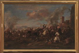 SCENA DI BATTAGLIA IN UN PAESAGGIO CON TORRI