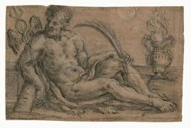 Figura allegorica con caduceo, ramo di palma e braciere. Gessetto nero e rialzi a matita bianca su carta vergellata. mm 115x176.