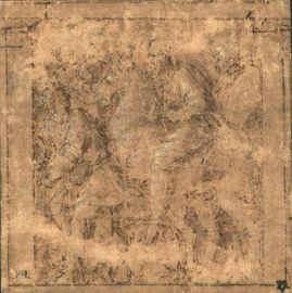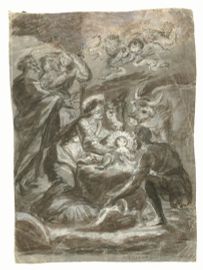 Natività. Gessetto nero, inchiostro bruno e tempera bianca su carta grigio-verde. mm 295x215.