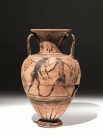 Decorazione accessoria: orlo, anse e piede esternamente verniciati, sul collo catena di palmette a dieci lobi contrapposte e concatenate; sulla spalla all’attacco col collo linguette radiali stilizzate, sotto la scena figurata fascia a vernice che rende il piano di appoggio delle scene, all’attacco col piede motivo a raggiera. Sotto le anse intreccio di quattro viticci, ciascuno desinente in un’ampia palmetta aperta a ventaglio a dodici lobi, centrato da una doppia palmetta contrapposta affiancata da due piccoli fiori di loto orizzontali