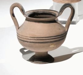 Cratere con orlo a tesa, con labbro ripiegato, collo cilindrico a profilo concavo, spalla appiattita, corpo ovoide, anse a bastoncello verticali, piede troncoconico; krateriskos con labbro svasato, collo troncoconico, corpo lenticolare, piede a tromba, anse a nastro verticali