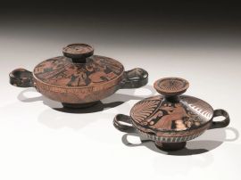 Decorazione: coperchio) da un lato figura femminile seduta a destra su una roccia, indossa collana, orecchini e armille auree ed un lungo chitone plissettato e fermato in vita da un nastro; nella mano destra tiene una tenia ricamata con frange e nella sinistra un tralcio di vite da cui pende un grappolo d’uva; sul lato opposto un erote in corsa nudo, con grandi ali spiegate adorno di collana a bandoliera, armille ai polsi e alle caviglie e calzari, tiene nella mano sinistra una ghirlanda e nella destra una tenia; alternate alle due figure grandi palmette aperte a ventaglio; sul labbro meandro ad onda; coppa) sul bordo falsa baccellatura, raccordo con il piede risparmiato